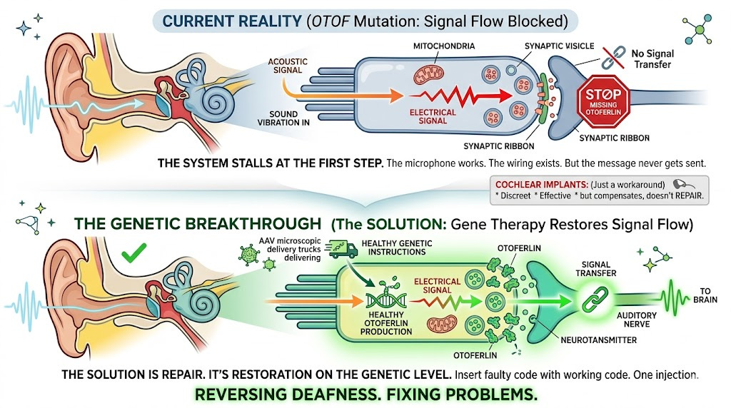 Sound to vibration to signal to sensing. Roughly speaking, this is how we hear. A complex system refined by evolution and instigated by vibration. Because of this, most of us experience the world as a tapestry of pitter-patter, of moments that create memories and complete our experience. But for some — for those born with a specific genetic condition — the world is silent. And for decades, this congenital deafness has been managed only through mechanical means. However, there's a recently reported trial that has shattered this reality. Through a single injection, deafness has been reversed. Hearing has been returned.